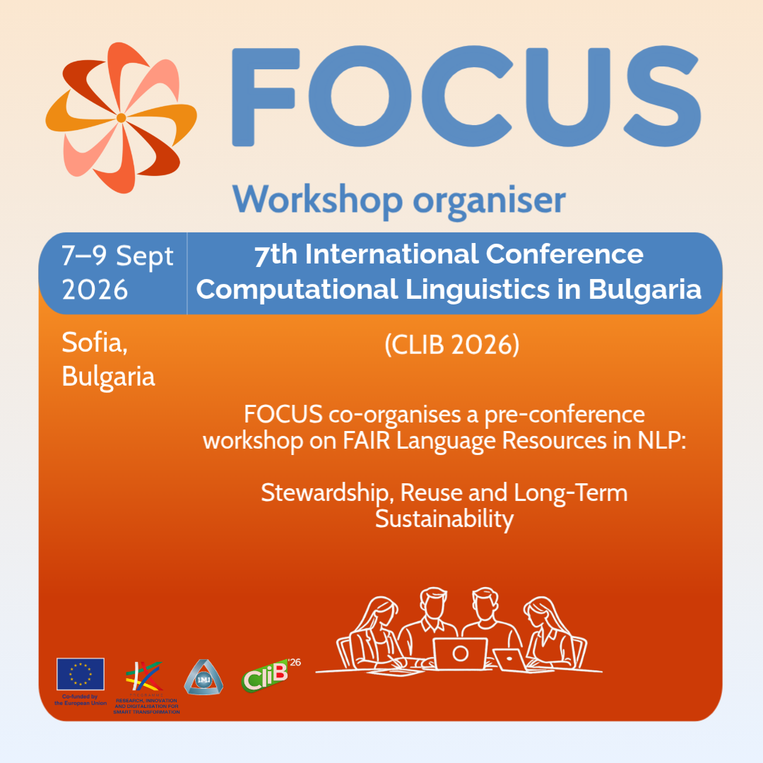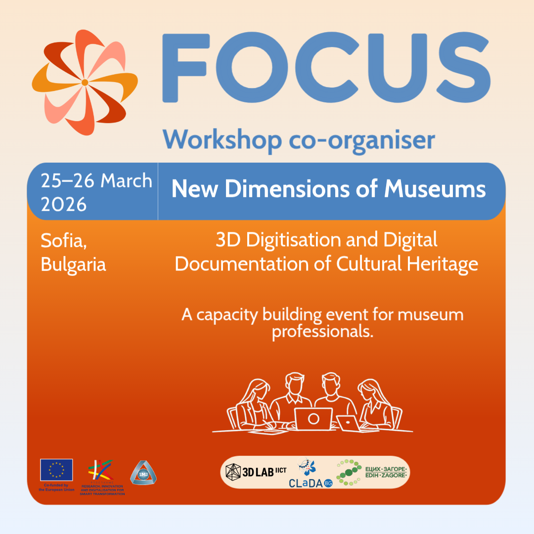 New Dimensions of Museums: 3D Digitisation and Digital Documentation of Cultural HeritageOur Next Event📅 Date: March 25–26, 2026📍 Sofia, ICCT, 2 Acad. G. Bonchev Str., Sofia 1113🎤 Working Language: BulgarianDetailsSolid Future(s) for Digital Heritage: Decentralising Access and Building TrustFuture EventA session within the Solid Symposium 2026📅 Date: 1 May 2026🏁 Start: 10.35 h🎤 Working Language: EnglishDetailsFAIR Language Resources in NLP: Stewardship, Reuse and Long-Term SustainabilityFuture EventWorkshop at CLIB 2026 (Satellite Event organised by FOCUS ERA Chair)📅 Date: 7 September 2026📍 Sofia, Bulgaria🎤 Working Language: EnglishDetails
